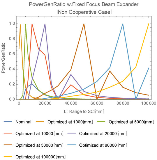 Assume a solar cell array module’s attitude is dynamically controlled and it always faces the transmitter (cooperative OWPT) (Figure 11). In this case, the transmitter optics does not need to independently control the X and Y directions and it is a single XY symmetrical beam expander, and its focus is adjusted using the relative range information between the module and the transmitter. Same as the condition in Section 3, the two lenses of the expander are of 150 mm and −30 mm focal length and their nominal separation is 120 mm. The simulation method for the cooperative OWPT is the same as the non-cooperative one and the necessary equations to calculate the power generation ratio including its range-dependent optimization for the cooperative OWPT model are given by setting ϕ = 0 (L = 0) in A1, A2, A3, and A4.
