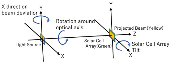 Since the solar cell array is fixed in a non-cooperative OWPT, the necessary DoF for beam alignment is 3, which is the relative attitude between the light source and the array. To determine beam alignment allowance, one needs to calculate the power generation ratio for the Figure 1 configuration with beam deviation along the X direction, Y direction, and rotation around the beam propagation direction (defined as the ‘optical axis’) (Figure 7). Details of the simulation method of the power generation ratio including such rotational perturbation are summarized in Appendix C.