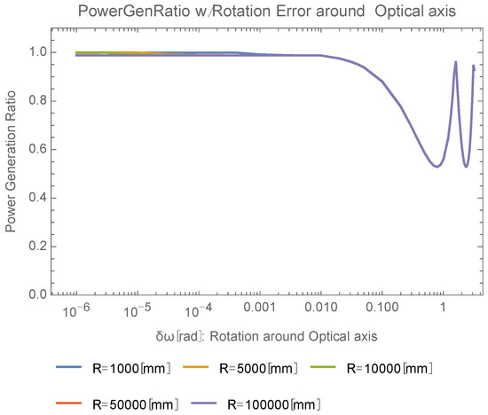 Similarly, the power generation ratio for the Y direction beam deviation, which is rotation around the X-axis, was calculated (Figure 9). Determined at an 80% power generation ratio, requirements for the beam deviation along the Y direction are, e.g., less than 2.51 mrad (L = 1 m), 631 μrad (L = 10 m), or 57.5 μrad (L = 100 m).