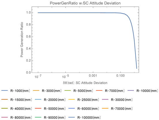 Regarding relative tilt, the apparent area of the incident beam increases like S / c o s θ , where S is the area of the beam at zero degrees, which is calculated by the method in Appendix A and Appendix B, and θ is the relative tilt angle between the beam and the array. Such an apparently deformed beam is received with the square shape array of the same area S. This causes degradation of the power generation ratio. This relationship is independent from L. Regarding the effect of the solar cell’s attitude deviation δ θ , it is necessary to consider this apparent size increase of the incident beam. To estimate the attitude deviation effect of the array, S p r j / c o s δ θ instead of S p r j is used in the calculation of the power generation ratio, where Sprj is calculated by the method summarized in Appendix A and Appendix B. Setting δ ψ = δ ϕ = δ ω = 0 and replacing the area of the array S p r j with S p r j c o s δ θ , these result in Figure 17.