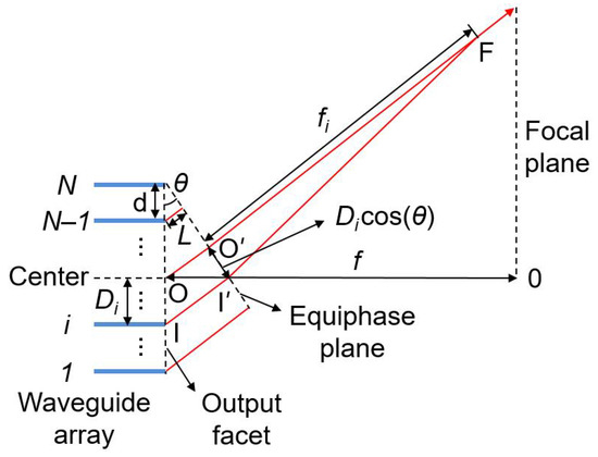 Figure 2 illustrates the wavelength separation and beam focusing functions of a WSL. The deflection angle is determined by the uniform phase difference between adjacent waveguides. An additional phase difference is designed according to the phase modulation of a convex lens and added to the deflected equiphase plane. Lights from the center of the output facet (point O) and the output facet of the i-th waveguide (point I) arrive at points O′ and I′ in the equiphase plane, respectively, and intersect with the same phase at point F. The line O′F is perpendicular to the equiphase plane. The optical path length difference of O′F and I′F should be equal to the optical path difference neffPi generated by the waveguide array for the focusing effect. According to Equation (2), the length difference ΔP of O′F and I′F can be written as