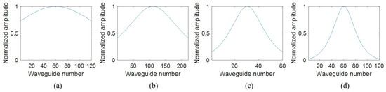 The simulated FWHMs of WSL1–3 are close to the values calculated from Equation (10), but the deviation is relatively large for WSL4, which can be attributed to the small amplitudes in the waveguides at the two sides of the waveguide array. Figure 4 shows the normalized amplitudes at the output facets of the BBAs in the WSLs. For WSL4, the normalized amplitudes in the waveguides at the two sides are small (~0.02) and have little contribution to the far field, similar to the effect of decreasing N. However, the truncation losses at the output facet of the BBAs of WSL1–3 are relatively large since less output power of the BBA is received by the waveguide array.