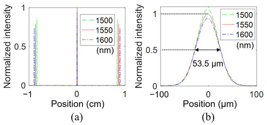 To demonstrate the focusing function of the waveguide lens, the length of the i-th waveguide is designed by setting the grating part (ΔL) to zero in Equation (1). The focal length is set to 10 cm. The simulated far-field distributions of the waveguide lens at the focal plane are shown in Figure 5. The distance between the zero-order and the first-order diffractions increases with longer wavelength, which is consistent with the grating function for multislit diffraction; that is, dsinθo = mλ, where θo is the diffraction angle and m is the diffraction order. Higher-order (m ≥ 1) diffractions will indeed see the dispersion effect, and the diffraction angle also increases for longer wavelength. The zero-order diffraction (m = 0) is wavelength independent, meaning that all wavelengths will be focused on the same line. The width of the zero-order focused line, measured as the FWHM of the intensity distribution on the detector plane, is calculated to be 53.5 μm, as shown in Figure 5b.