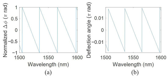 As discussed in Section 2, to calculate the deflection angle of a WSL, the phase difference Δφ should be normalized in the range of (–π, π). The normalized Δφ and deflection angle θ of WSL2 are calculated according to Equation (6) and plotted in Figure 6 for three FSRs. Under the system implementation as indicated in Figure 1a, within one FSR, the longer wavelengths will appear on the right side of the camera.
