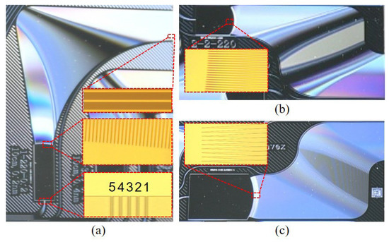 Figure 7 shows photos of the fabricated devices. Figure 7a shows a photo of WSL2 with the one-arc layout. Figure 7b is a photo of the WG lens without grating effect, and Figure 7c displays WSL4, both adopting the three-arc structure. Some microscope images are placed in the insets, revealing fine structures of the chip. The sizes of the chips are summarized in Table 1.