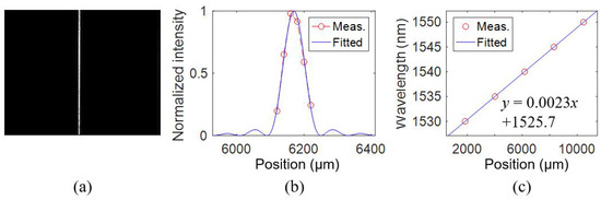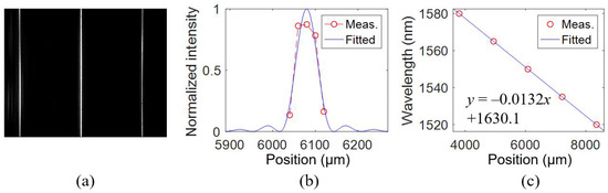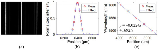 By designing the relative waveguide length for the beam focusing function according to Equation (2), the focal length of WSL can be changed. WSL1 is designed with a focal length of 5 cm, whereas the focal lengths of the rest devices in Table 1 are 10 cm. Figure 10a shows the spectral lines of WSL1. Figure 10b shows the measured far-field distributions, which are fitted by multislit diffraction [21]. The fitting method is the same as that in [15]. The FWHM is 0.74 nm. Figure 10c plots the measured and fitted wavelengths at different pixel positions.