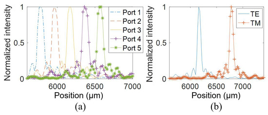 Far-field distributions of WSL2 at 1540 nm for (a) different input ports under TE polarization and (b) the central input Port3 under both polarizations.