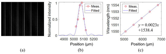 To reach a higher resolution, WSL3 with only 60 waveguides is fabricated. The measured results are shown in Figure 13. The measured far-field intensity is fitted and shown in Figure 13b. The FWHM is found to be 0.15 nm at 1550 nm, corresponding a wavelength resolving power of ~104. The difference between the FWHMs of WSL2 and WSL3 is not as large as that in the simulation, which can be attributed to the larger phase error of WSL3 as it has a much larger footprint. Figure 13c shows the wavelengths at different pixel positions. The measured FSR is only 4.4 nm but can be expanded by increasing the number of waveguides while keeping a small FWHM, according to Equation (10). The shallow spectral lines near the bright ones in Figure 13a might be caused by the Fabry–Perot resonance within the chip induced by the reflections at the input and output facets, which can be suppressed by antireflection coating at the facets.