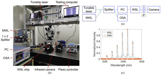 A diagram of the experimental setup is shown in Figure 15a. The WSL is first calibrated by the tunable laser (EXFO T100S-HP). Then the source is changed to the MWL. Both the polarizations of the tunable laser and the MWL are set to TE. A 1 × 2 splitter is used to split light to the WSL and OSA. When the MWL is selected, the spectral lines are captured by the camera and measured by the OSA simultaneously. A photo of the experimental setup for measuring the optical spectra is shown in Figure 15b.