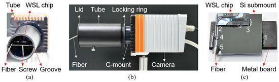 (a) Inside view of a tube holding a WSL chip. (b) Side view of the tube mounted to a C-mount camera. (c) Photo of the WSL chip fixed on a silicon submount and a metal board. The labeled numbers indicate the order of UV curing.