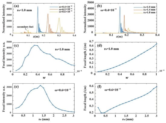 Adjustable focal length and focal intensity. (a) The peak intensity as a function of z with different w at r0 = 1 mm; (b) The peak intensity as a function of z with different r0 at w = 0.4 × 10−4. (c) The focal intensity as a function of w. (d) The focal length as a function of w. (e) The focal intensity as a function of r0. (f) The focal length is a function of r0.