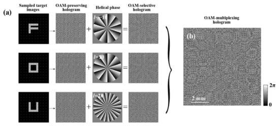 An OAM-multiplexing hologram is designed and sampled as discrete spots in its spatial frequency domain to conduct an experimental demonstration. Figure 4 illustrates the design procedure of a hologram. For example, three target images, namely letters ‘F’, ‘D’ and ‘U’ of SF Square Head font with 1080 × 1080 pixels, are used to generate a hologram. Three helical phase modes with l = −10, 10, and 20 are adopted for encoding. The sampling constant is 40 pixels in the experiment. Three OAM holograms can be generated by conducting an iterative inverse Fourier transform on the sampled target images [9,26]. By combining the three holograms into one, an OAM-multiplexing hologram can be finally obtained, as shown in Figure 4b.