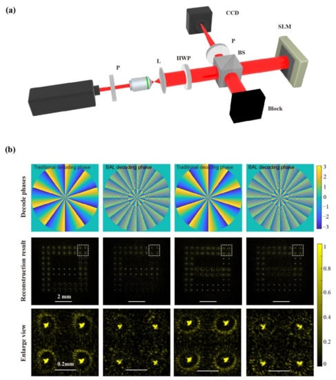 Experimental implementation. (a) Optical setup. P: linear polarizer; L: lens; BS: beam splitter; HWP: half-wave plate. (b) Decoding the OAM multiplexing hologram with traditional and BAL decoding methods with the same exposure time, the top row of pictures is the decoding phase, and the following two lines of pictures are the decoding results.
