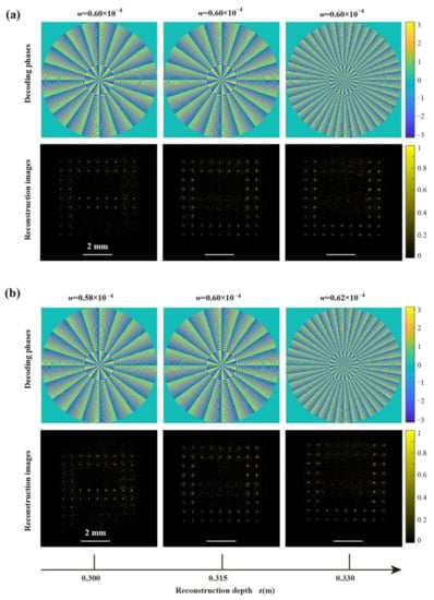 Two letters, ‘F’ and ‘D,’ are used to design the OAM multiplexing hologram with the encoded helical phase index 10 and −10. The reconstruction results of this method and the traditional method are depicted in Figure 5b. Clearly, the doughnut-shaped cross-talk remaining in the reconstruction image can be suppressed greatly. Moreover, the focal length can be flexibly controlled by adjusting the parameter of the BAL phase map, as shown in Figure 6. By using three decoding BAL phases with distinct parameters w = 0.58 × 10−4, w = 0.60 × 10−4, and w = 0.62 × 10−4, three images can be reconstructed with high quality and great stability at different distances of 0.300 m, 0.315 m, and 0.330 m, respectively (bottom of Figure 6b). It is worth noting that the image magnification gradually increases as the reconstruction distance increases. The size of the reconstructed image ‘U’ is about 1.08 times that of ‘F’. When decoding one image channel of the OAM multiplexing hologram, the desired reconstruction image suffers from cross-talk with the other two image channels. In addition, due to the light intensity oscillations behind the focal plane (Figure 1 and Figure 2), several secondary focal planes occur. Therefore, the primary reconstruction distance should be chosen in practical applications to avoid cross-talks in the reconstruction images.