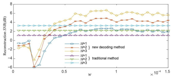 The SNR of the BAL decoding method is influenced by the parameters w, r0 and the difference of the helical phase indices Δl = ln − ln−1. At r0 = 1 mm, the SNR will decrease first and then increase gradually as w increases (Figure 7). However, when w > 0.5 × 10−4, the reconstruction SNR can be improved by about 2dB compared to the conventional method. Notably, a smaller scaling coefficient w will cause greater background intensity and oscillation variation, leading to a much lower reconstruction SNR. Therefore, a greater w is preferred in terms of SNR. In addition, the BAL phase is directly imposed on the OAM multiplexing hologram for decoding; thus, the quality of reconstructed images is not worsened when the encoded helical index increases.
