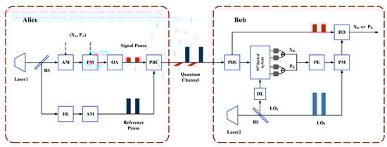 Figure 1 shows the scheme of the LLO CV-QKD system based on pilot polarization multiplexing [,]. At the transmitter, Alice first transforms the continuous-wave light generated by laser into the optical pulse sequence with a time period of . And then the optical pulse sequence is divided into signal pulse and reference pulse by BS. For signal light, Alice loads the Gaussian random number pairs on the amplitude and phase of the signal pulse through AM and PM. After electro-optic modulation, the amplitude and phase of signal pulse are modulated to and , respectively. Subsequently, the power attenuation of the signal pulse is carried out by OA to obtain the coherent state sequence . Another optical pulse signal output by BS will be used as a reference pulse to provide phase information at the receiver. The reference pulse first delays to ensure that it is separated from the signal pulse in time, and then the reference pulse sequence with fixed amplitude is obtained through AM. Generally, the power of the reference pulse is larger than two orders of magnitude of the signal pulse, which avoids photon leakage while ensuring the SNR of the reference pulse. Then, PBC combines the signal pulse with the reference pulse and sends it to the receiver through the quantum channel.