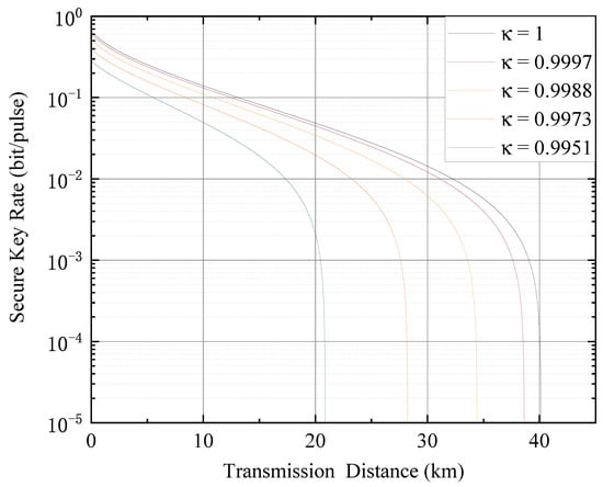 Figure 3 shows the secure key rate of CV-QKD system under different phase noise levels. Parameters of system are from the experiment in reference []. The impact of phase noise on channel transmission and excess noise of system can be measured by parameter . The smaller value indicates the greater phase noise. indicates that the phase difference between the signal light pulse and is perfectly compensated. When the phase noise is zero, the secure key rate at 15 km is 0.082 bit/pulse. Additionally, when the phase noise is , it decreases to 0.019 bit/pulse. The results show that the phase noise can significantly affect the secure key rate and transmission distance of the system.