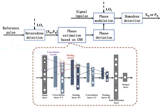 For LLO CV-QKD system, the compensation of phase contains two steps. First, a phase estimation algorithm is used to estimate the value of phase drift between and reference pulse, and then the estimated value of the phase drift is used to recover the phase of . The after recovery will be used to measure the quadrature component of the signal optical pulse. The proposed CNN-based phase compensation method will directly process the measured value of the quadrature component of the reference pulse to output the estimated value of the phase drift, as shown in Figure 4.