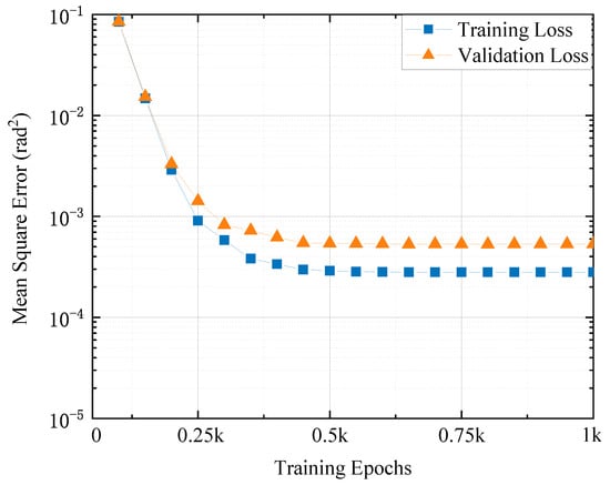 where N is the value of batch size, which is set to 600 in simulation. The above training is performed a total of 1000 epochs. The initial learning rate is set to 0.01, which decrease to one tenth of the original after 500 epochs. Figure 5 shows the change of the loss function value in training process of CNN-based phase compensation method. The loss of the training set and the verification set decreases rapidly, and tends to be stable after 500 epochs.