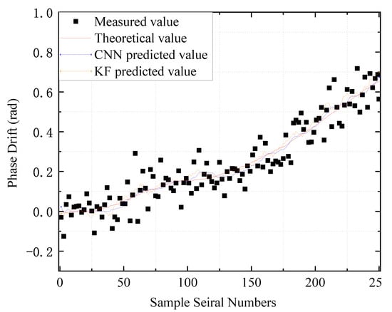 For LLO CV-QKD system, the compensation of phase drift consists of phase estimation and phase recovery, and the accuracy of phase estimation is the key factor to performance of compensation. According to this, we compare the results of phase estimation based on KF and CNN. The accuracy of phase estimation of KF-based method and CNN-based method are shown in Figure 6. The black scatter, measurement value of phase drift in reference pulse, uniformly distribute near the ideal phase drift curve.