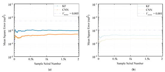 The variance of noise is 0.005 and 0.001, respectively, as shown in Figure 7a,b, and the MSE of KF-based and CNN-based phase compensation approaches is approximately stable after 150 reference pulses. In Figure 7a, the MSE of the CNN-based phase compensation method converges to and the phase noise is reduced by , while the MSE of the KF-based method converges to and the phase noise is reduced by . It can be seen from the comparison of the results that the accuracy of the CNN-based phase compensation method is better than that of the KF-based method under different SNR. Moreover, as the SNR of the system decreases, the performance of the KF-based method decreases significantly, and the CNN-based phase compensation method can still obtain ideal performance. In Figure 7b, The MSE of CNN-based method finally converges to , and the phase noise is reduced by , while the MSE of the method based on KF finally converges to , and the phase noise is reduced by .