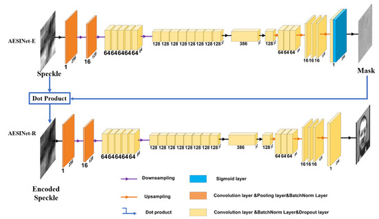 AESINet is composed of two parts that are respectively used for the construction of adaptive encoding and the reconstruction of a hidden target structure. In the first stage, AESINet-E takes the original speckle as input, and it is responsible to build the intrinsic relationship between the original speckle image and its corresponding ideal encoding pattern. After the encoding process, the data separability of the encoded speckle is effectively enhanced compared with the original speckle, which will be proved in the following experiments. AESINet-R as the second stage takes the encoded speckle as input, which can better extract features that contain hidden target structure information. is calculated by: