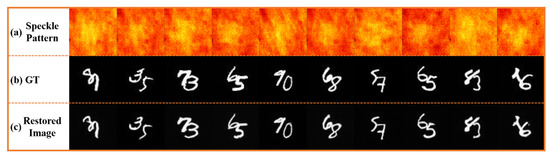 - Random encoding modulation: The randomly generated gaussian encoding mask is employed to modulate the original speckle, and the modulated signal is used to train the AESINet-R. To avoid the influence of randomness on the experimental conclusions, three different sets of random masks are generated and tested. The reconstruction results are shown in Figure 7e,f, respectively.