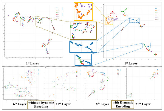 In this section, experiments were conducted to verify that the adaptive encoding process can improve the separability of data. The face targets with the corresponding speckle were used as the experimental dataset, and the low-resolution speckle signal was used as the input to train the complete AESINet. At this time, the input of AESINet-R was the speckle image after adaptive encoding, and then the training model was saved. The same training set was directly input into the AESINet-R without adaptive encoding as a contrast experiment. Six untrained speckle images from the test set were input into the above two AESINet-R network models, and the feature maps at each layer were saved. The feature maps output by each layer of the network were mapped from high-dimensional space to low-dimensional space. When different speckles were used as input, the distance of the feature map in the low-dimensional space was compared to analyze the impact of adaptive encoding on the data separability.