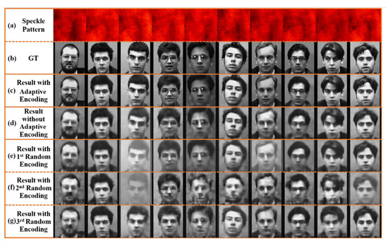 The average MAE, SSIM, and PSNR of the recovered results of the test set under the three modulation modes are shown in Table 2. The results with adaptive encoding are better than the results of the non-encoding and random encoding. Compared with the method of directly using the original speckle as the input of the reconstruction network, the PSNR of the recovered target is increased 1.8 dB and the SSIM is increased 0.107 by the adaptive encoding method. Those results prove that the improvement of the data separability by the adaptive encoding technology does help the reconstruction network to extract effective features. The result in Table 2 fully explains the instability of random encoding, and also shows that this modulation method can not improve the quality of reconstructed images. In the three repeated experiments, the first random mask obtains the best indicators, but the quality of the reconstructed image is only roughly equal to that of the method without encoding modulation, and even the visual effect of some images in Figure 7e is reduced compared with that in Figure 7d.