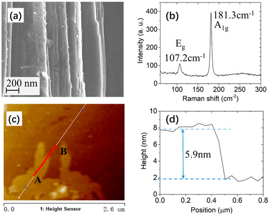 (a) SEM image; (b) Raman spectrum; (c) AFM image; (d) corresponding height curve.