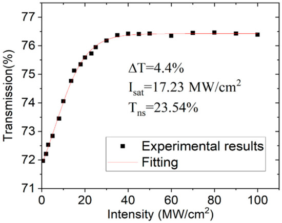 The nonlinear transmission curve was fitted according to the experimental values (Figure 2). A 78 ns solid-state Q-switched laser at 1.06 μm wavelength was constructed as the test light source. In our opinion, the saturable absorption of the SnSe2-SA sample near 1 μm was mainly caused by the edge energy levels and atomic vacancy defect energy levels [31,32,33]. By fitting the experimental data, an approximated initial transmittance (T0) of 72% could be obtained. When the saturable absorber was saturated, the saturated transmittance (Tsat) was fitted to be about 76.42%. The modulation depth ΔT, saturation intensity Isat, and non-saturated absorption rate Tns were determined to be 4.4%, 17.23 MW/cm2, and 23.54%, respectively.