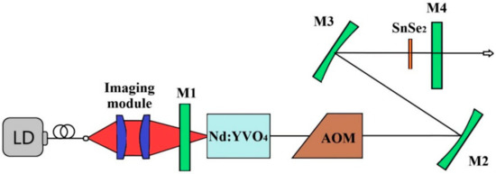 Figure 3 exhibits the setup of the APDM QML laser modulated by AOM and SnSe2-SA. A four-mirror resonator with a cavity length of 141.5 cm was set up. Plane mirrors M1 and M4 acted as the input mirror and output mirror, respectively. Spherical concave mirrors M3 (ROC = 500 mm) and M4 (ROC = 150 mm) both had a high-reflection coating at 1064 nm. The transmittance of the output coupling mirror M4 was 15%. An optical coupling system was used to couple the pump light from the pump source into the laser crystal. The pump source emitting at 808 nm was a fiber-coupled diode laser with a beam diameter of 400 μm and maximum output power of 20 W. A 3 × 3 × 8 mm3 Nd:YVO4 crystal (0.5 at.%) was selected as the laser medium to achieve laser amplification at 1064 nm. As one of the most excellent laser media for diode-pumped solid-state lasers, the Nd:YVO4 crystal features large emission cross-sections, as well as high environmental stability, which are beneficial to generate high peak power and narrow pulse width [9,34]. Furthermore, the cross-sectional size of 3 × 3 mm2 and the doping concentration of 0.5 at.% were conducive to the heat dissipation, reducing the thermal effect of the Nd:YVO4 crystal and resulting in a better laser characteristics [35]. An AOM with a 45 mm long quartz crystal was used as the active modulator. The entire experiment was carried out at a room temperature of 25 °C. Both the Nd:YVO4 and the AOM crystals were maintained at 18 °C by a water chiller to mitigate thermal effects. The SnSe2-SA was placed at a tight focusing position near M4 to provide steady and effective mode-locking. According to the ABCD matrix, the average beam waist radius at the position of the absorber was about 113 µm. A photoelectronic diode and a TDS620B digital oscilloscope (Tektronix, Beaverton, OR, USA) were used to record the pulse temporal behavior.