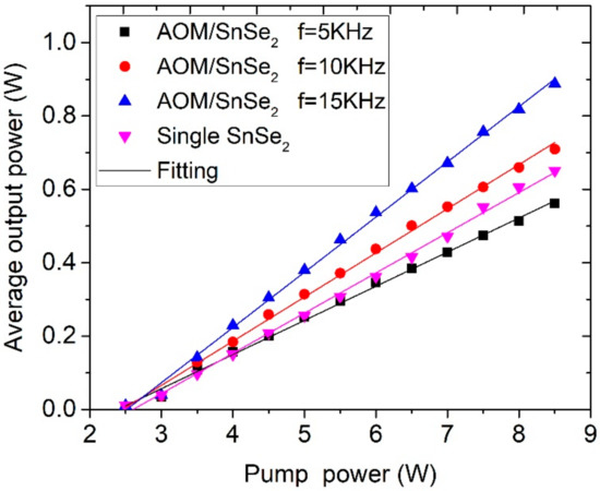 Figure 4 shows the variation curves of the average output powers of SnSe2 single QML and AOM/SnSe2 APDM QML lasers. The average output power increased monotonically with increasing pump power. Under the pump power of 8.5 W, the average output powers of 561, 710, and 889 mW were obtained from the AOM/SnSe2 APDM QML laser under f = 5, 10, and 15 kHz, respectively. Moreover, 651.2 mW power could be obtained for the single passive QML laser with SnSe2-SA. By fitting, the slope efficiencies of 11%, 9.3%, 12%, and 15.1% could be obtained for SnSe2 single and AOM/SnSe2 APDM QML lasers at f = 5, 10, and 15 kHz, respectively. Obviously, a larger modulation frequency could produce a higher average output power.