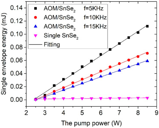 For further analysis of the pulse energy, the repetition rates of Q-switched envelopes in the SnSe2 single QML laser were also recorded. Within the pump range of 2.5 W to 8.5 W, the repetition rates of the Q-switched envelopes increased from 26 kHz to 225 kHz. Combining the pulse repetition rates and average output power, the single envelope energies could be calculated as depicted in Figure 5. Under the pump power of 8.5 W, single envelope energies of 112, 71, and 59.2 μJ could be obtained from APDM QML lasers with AOM/SnSe2 for f = 5, 10, and 15 kHz, respectively. However, in the single QML laser with SnSe2, only 2.9 μJ single envelope energy could be achieved. The maximum single envelope energy obtained by the APDM QML laser was about ~39 times as large as that of the single QML laser. This was mainly due to the lower pulse repetition rate produced by the APDM QML laser.