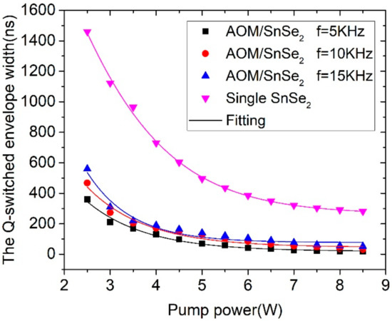 Figure 6 shows the variation of the envelope width with the pump power. For QML lasers with SnSe2, the shortest Q-switched envelope duration of 291 ns was obtained at 8.5 W pump power. However, the APDM mechanism could greatly reduce the envelope width. The shortest Q-switched pulse envelope durations of 18, 34, and 52 ns were obtained in APDM QML lasers with AOM/SnSe2 at f = 5, 10, and 15 kHz, respectively, which were much narrower than that of the single QML laser. The maximum compression ratio of the Q-switched envelope duration was approximated to be 93.8% from 291 ns (in SnSe2 QML laser) to 18 ns (in AOM/SnSe2 QML laser).