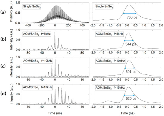 Furthermore, the number of mode-locked pulses in the envelope decreased significantly as the width of the envelope decreased. The temporal shapes of QML pulses under the pump power of 8.5 W were recorded (Figure 7). Figure 7a shows the temporal profiles of single Q-switched envelope and single mode-locked pulse in QML laser with single SnSe2. The single mode-locked pulse width displayed by the oscilloscope was 760 ps. For APDM QML laser, the number of mode-locking pulses in one envelope decreased to only a few with decreasing pulse repetition rate. The corresponding temporal profiles for different modulation frequencies are exhibited in Figure 7b–d. As shown in the figures, there were only two, three, and five mode-locking pulses in one envelope for f = 5, 10, and 15 kHz, respectively. The corresponding pulse widths of single mode-locked pulses displayed by the oscilloscope were 544, 591, and 620 ps, respectively.