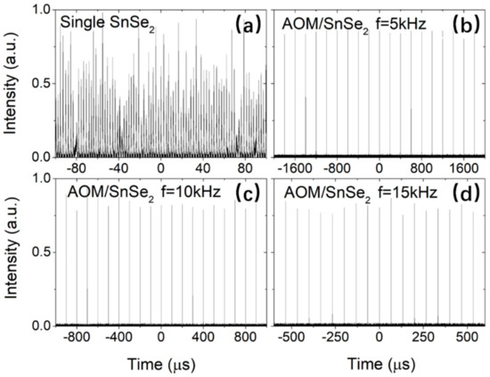 Oscilloscope shapes of the envelope sequences at 8.5 W pump power: (a) single SnSe2-SA QML; (b) SnSe2/AOM APDM QML with f = 5 kHz; (c) SnSe2/AOM APDM QML with f = 10 kHz; (d) SnSe2/AOM APDM QML with f = 15 kHz.