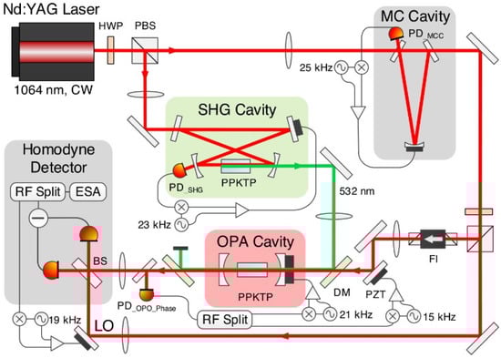 The experimental setup is illustrated schematically in Figure 1. The fundamental laser source is a commercially available continuous-wave (cw) Nd:YAG laser which emits 2.0 W of coherent light at wavelengh 1064 nm with a linewidth of 1 kHz. The fundamental light firstly went through a half-wave plate (HWP) and a polarizing beam splitter (PBS) to control the power of the pump beam and the seed beam. The PBS separated the fundamental light into two parts: the majority of the fundamental light was efficiently frequency doubled in a bow-tie enhancement second harmonic generation (SHG) cavity, which was described in detail in Ref. [], to produce a pump light at 532 nm for an subthreshold OPA. The remaining light was spatially filtered by a high finesse mode-cleaner cavity (MCC) and split-off to provide a seed beam for the OPA and a local oscillator (LO) beam for the homodyne detection system. The MCC in our experiment is a ring cavity that consists of two identical flat input–output mirrors with reflectivity of R = 99.0 ± 0.5% and a concave mirror with reflectivity of R = 99.99%, and it has a total resonator length of 56 cm with 1 m radius of curvature. We observed a finesse up to 1500 which provided the linewidth of the MCC about 300 kHz. We measured the intensity noise of the transmitted beam, and the results showed that the intensity noise was closing the quantum noise limit (QNL) at 3 MHz.