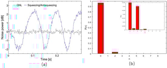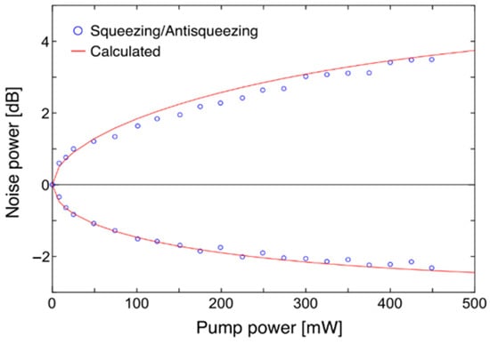 Figure 4 shows the observed squeezing and anti-squeezing levels with different pump powers from 0 to 450 mW. The blue circles indicate the observed squeezing and anti-squeezing levels, in which all data are normalized to the QNL reference. The red curve is the theoretical prediction of the component of squeezing () and anti-squeezing (), which is derived from Equation (2) using the measured values in the experiment: