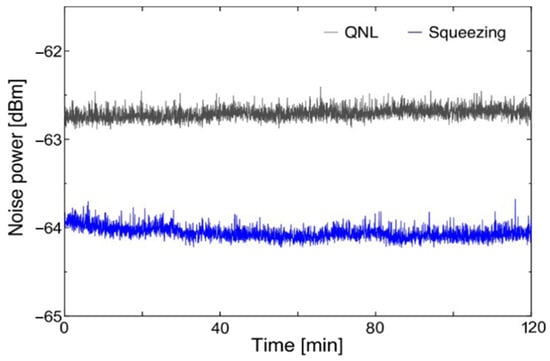 When the length of the OPA was controlled, the pump light was injected into the OPA, and the relative phase between the pump light and seed light was locked at π; it is possible to observe stable amplitude squeezed vacuum states (Figure 3). After locking the relative phase between the squeezed vacuum light and LO for the HD at π/2, the generated amplitude squeezed state can be measured continuously. Figure 5 shows the noise power of a generated squeezed vacuum state at analysis frequency 11 MHz by a spectrum analyzer with an RBW of 100 kHz and a VBWof 100 Hz. As shown in Figure 5, we find that the noise of the generated squeezed state can be measured and recorded continuously for 2 h.