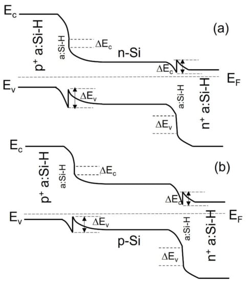 - Korte, L.; Schmidt, M. Doping type and thickness dependence of band offsets at the amorphous/crystalline silicon heterojunction. J. Appl. Phys. 2011, 109, 063717. [Google Scholar] [CrossRef]