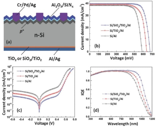 - Nagamatsu, K.A.; Avasthi, S.; Sahasrabudhe, G.; Man, G.; Jhaveri, J.; Berg, A.H.; Schwartz, J.; Kahn, A.; Wagner, S.; Sturm, J.C. Titanium dioxide/silicon hole-blocking selective contact to enable double-heterojunction crystalline silicon-based solar cell. Appl. Phys. Lett. 2015, 106, 123906. [Google Scholar] [CrossRef]