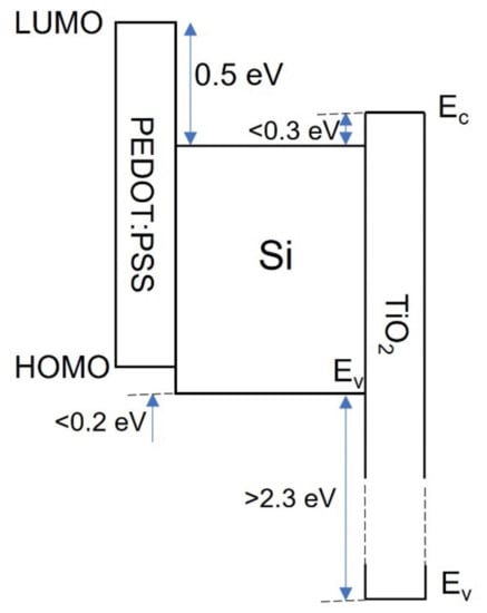 - Avasthi, S.; McClain, W.E.; Man, G.; Kahn, A.; Schwartz, J.; Sturm, J.C. Hole-Blocking titanium oxide/silicon heterojunction and its application to photovoltaics. Appl. Phys. Lett. 2013, 102, 203901. [Google Scholar] [CrossRef]
