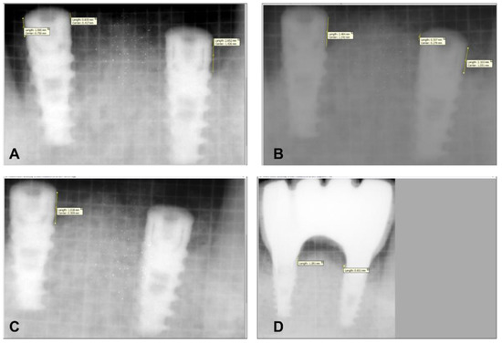An RVG was taken to ascertain the proper implant placement, and only thereafter was the cover screw fixed. Primary closure of the flap was obtained via simple interrupted sutures (Figure 1C) and with the application of an ice pack for 3–5 h externally to the operated location, as instructed in the immediate postsurgical time. Postoperative medications comprising amoxicillin 500 mg TID, analgesic diclofenac potassium, and serratiopeptidase TID were prescribed for 5 days. In addition, 0.2% chlorhexidine mouth rinse was also prescribed twice daily for two weeks. The clinical parameters and the radiographic data were obtained at baseline (Figure 2A), 3 months (Figure 2B), 6 months (Figure 2C), and 9 months (Figure 2D).