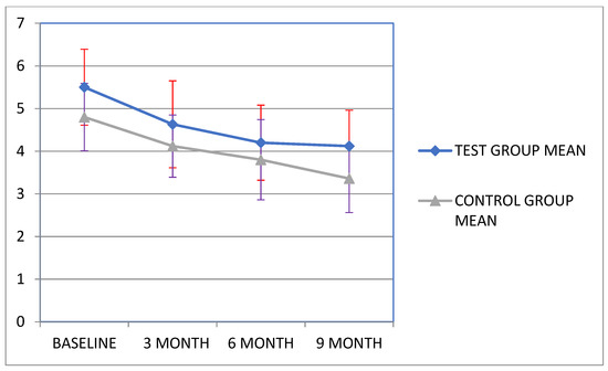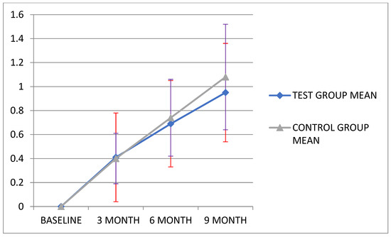 The intergroup comparison of the mean PI, GI, PD, CAL, and MBL in the test and control groups at baseline, 3 months, 6 months, and 9 months follow-up are presented in Table 5.
