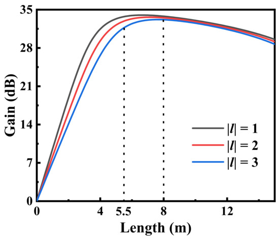 In this research, the modal gains, as a function of the RC-EDF length, were simulated at the 1550 nm level using the rate and light propagation equations as a foundation [28,29], as shown in Figure 5. The conditions in the simulation were as follows: (1) the signal power was −12.7 dBm; (2) the pump power was 800 mW; and (3) the erbium doping concentration was 1.3 × 1025 m−3. It can be seen that modal gains increased with the increased in the RC-EDF length at the beginning, while the modal gains gradually tended to decrease with the further increase in the RC-EDF length. This is due to the depleted population inversion caused by the increasing signal power. Theoretical analyses and numerical simulations illustrated that the optimal modal gains (|l| = 1~3) could be obtained in the RC-EDF length range of 5.5~8 m. The maximum modal gains could be larger than 33 dB.