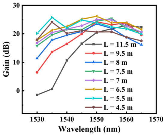 The effect of the RC-EDF length on the amplification characteristics was investigated in the experiment. The spectra of the amplified OAM modes based on RC-EDFs of different lengths were measured at a launched pump power of 800 mW and an input signal power of −12.7 dBm. Eight wavelength channels were spaced equally from 1530 to 1565 nm. The OAM modes (|l| = 1~3) have similar amplification characteristics. In order to investigate the effect of the RC-EDF length on amplification characteristics, the highest-order (|l| = 3) OAM mode was taken as a typical mode. Figure 6 presents the measured gain spectra of the OAM mode (|l| = 3) for eight different fiber lengths with respect to the wavelength to achieve clarity. Since the erbium doping distribution of the fabricated RC-EDF was not as uniform as it was in the simulation, the actual gain was not as high as it was in the simulation. The gain peak became blue-shifted as the RC-EDF length decreased. The gain peaked at the 1560 nm level for the L = 11.5 m RC-EDF. The gain peak shifted toward 1550 nm when the RC-EDF length was reduced to 6.5 m. When the length was further reduced to 5.5 m, the gain peak shifted to the 1535 nm level. However, the gain peak did not remain blue-shifted as the RC-EDF length further decreased due to the effects of an absorption band in the RC-EDF at the 1535 nm level. As the length was further reduced to 4.5 m, the gains over the whole C band decreased overall. In addition, the gain difference between the 1530 and 1565 nm levels was approximately 24.4 dB for the 11.5 m RC-EDF. The gain imbalance was significantly improved as the RC-EDF length was shortened, owing to the reduction in the reabsorption effect and absorption. With the 11.5 m RC-EDF, the amplified power was lower than the absorbed power was at the 1530 nm level, which resulted in a negative net gain due to the reabsorption effect [30]. This means that the amplified power under the excessively long RC-EDF was strongly reabsorbed due to the Er3+ absorption band at around the 1535 nm level.