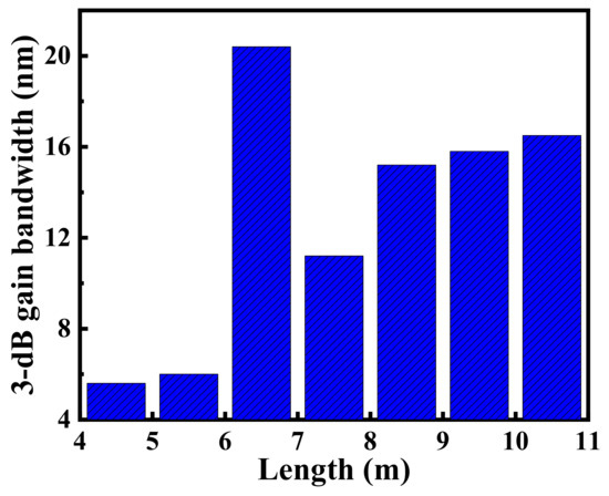 The amplification characteristics with respect to the RC-EDF length were further investigated concerning the 3 dB gain bandwidth, which is also one of the important indicators for evaluating the performance of EDFAs. Figure 8 shows the 3 dB gain bandwidth for different RC-EDF lengths. The overall trend was non-monotonic, and the bandwidth became wider as the fiber length increased. In particular, a 6.5 m RC-EDF resulted in a flatter gain spectrum for which the 3 dB gain bandwidth was increased to 21 nm, spanning from 1541 to 1562 nm. The 3 dB gain bandwidth decreased with an increase in the RC-EDF length from 6.5 to 7.5 m due to the effects of increased absorption with the excessively long RC-EDF. By further increasing the RC-EDF length, the absorption at the short wavelengths would allow the gain at the long wavelengths due to the reabsorption effect. The 3 dB gain bandwidth decreased with a reduction in the fiber length from 6.5 to 4.5 m, which was due to the protuberant gain peak at the 1535 nm level. If a traditional gain equalizer were utilized—for example, long-period gratings [31]—a far broader gain spectrum could be obtained.