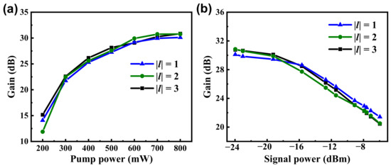The dependence of the gain on the signal power and pump power was tested at the 1550 nm level using the 6.5 m RC-EDF. Figure 9a presents the modal gains (|l| = 1~3) with respect to the pump power at a signal wavelength of 1550 nm and the signal power of −24 dBm. The gain increased gradually with an increase in the pump power and tended towards saturation when the pump power exceeded 600 mW. The modal gains (|l| = 1~3) with respect to the signal power at the 1550 nm level were also measured, as shown in Figure 9b. The gain gradually decreased as the signal power increased. The maximum gains of OAM modes were measured to be up to 30.1 dB. The maximum output power levels were measured to be up to 14.5 dBm.