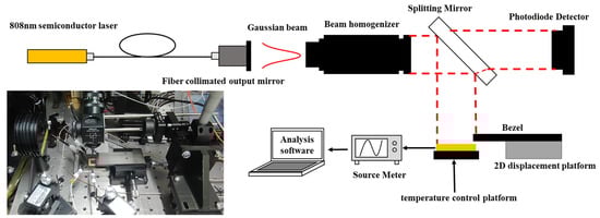 We used homemade 808 nm single-junction GaAs laser photovoltaics (area: 1 × 1 cm2), combined with a temperature-controlled platform for the experiments, and the test platform is shown in Figure 1.